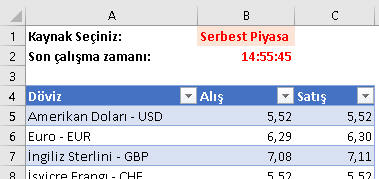 bulunan döviz tablosunu Excel içine almak istiyoruz.